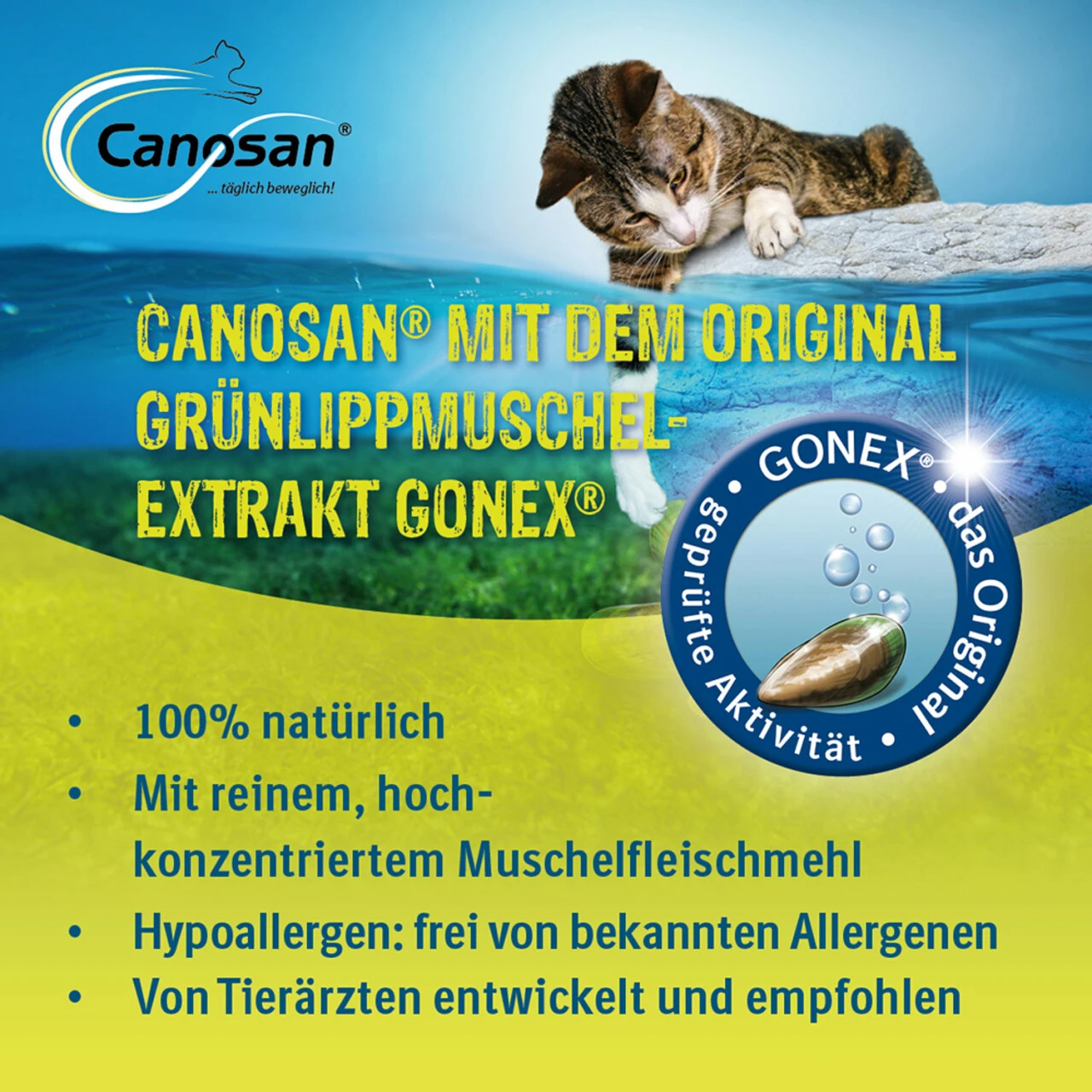 Die besonderen Eigenschaften von Canosan beruhen auf seinem Inhaltsstoff Gonex mit aktivem Grünlippmuschel-Extrakt.