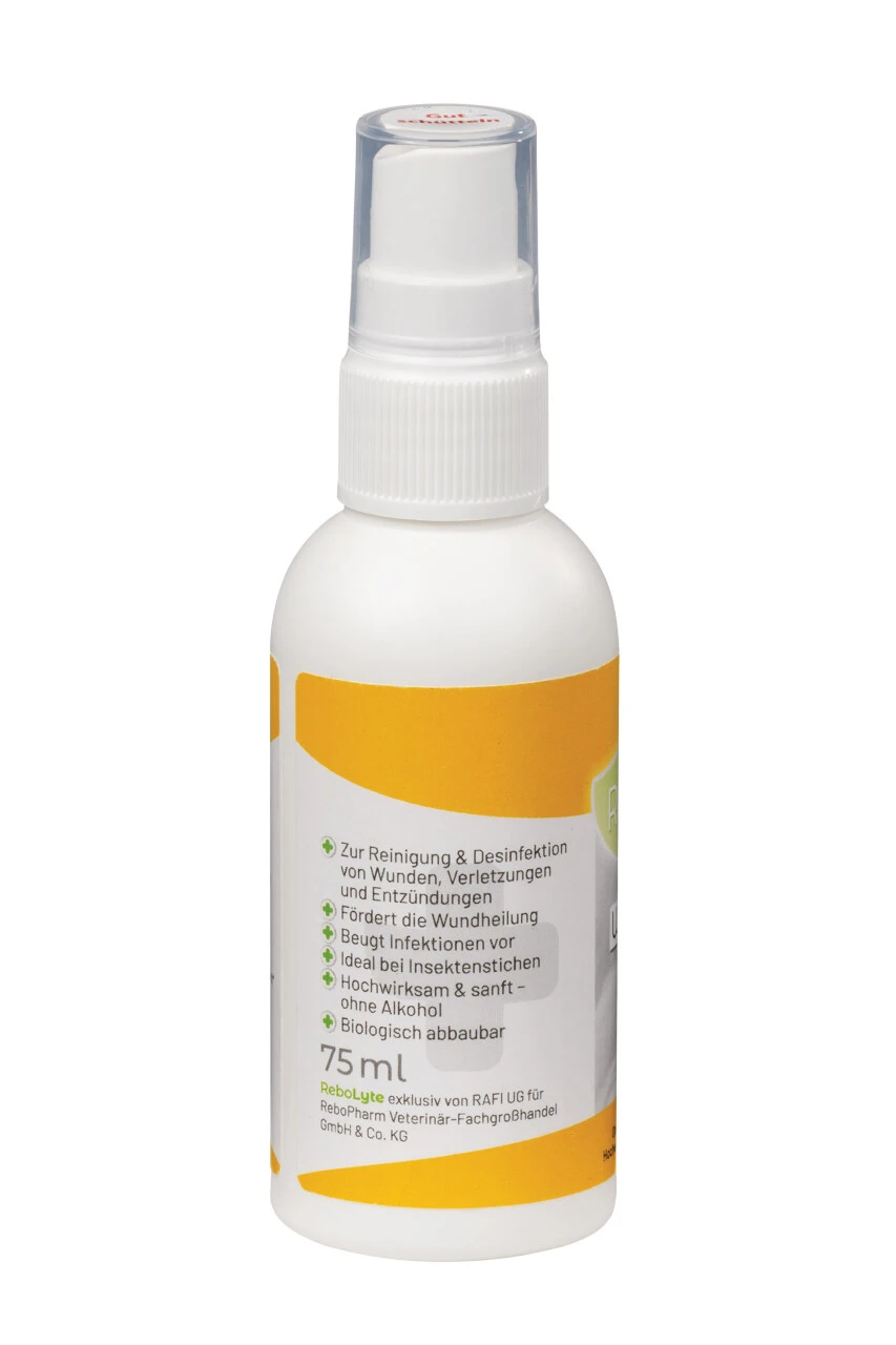 ReboLyte Wundpflegesprühgel reinigt und desinfiziert alle Arten von Wunden, Ekzemen und Entzündungen hygienisch wirksam und sanft. Es enthält keinen Alkohol und kann sowohl für den Wundrandbereich als auch für den Wundbereich selbst eingesetzt werden. Es ist für alle Haus- und Nutztiere geeignet sowie nebenwirkungsfrei und gut verträglich.